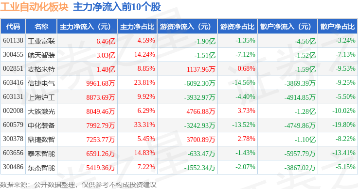 从资金流向上来看,当日工业自动化板块主力资金净流出27.65亿元,游资资金净流入7.14亿元,散户资金净流入20.51亿元。工业自动化板块个股资金流向见下表: