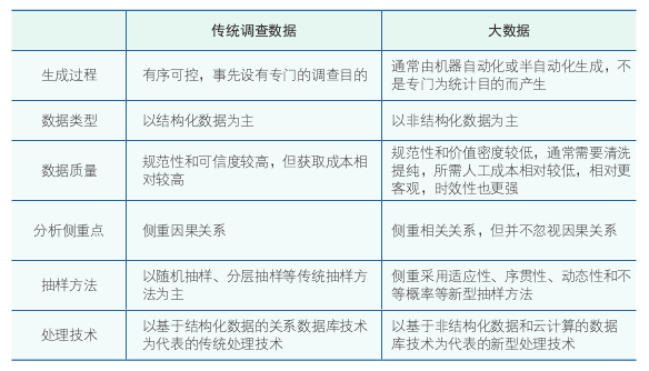 根据国家统计局和国家发展和改革委员会联合印发的《非传统数据统计应用指导意见》,大数据是非传统数据的主体,在很多情形下可以代指非传统数据。具体而言,大数据是指通过非传统政府统计调查获取的数据(国外一些机构也称之为“二手数据”),包括政府部门的行政记录数据、商业记录数据、互联网数据、电子设备感应数据及其他大数据。大数据与传统调查数据存在以下主要差异(见表1)。