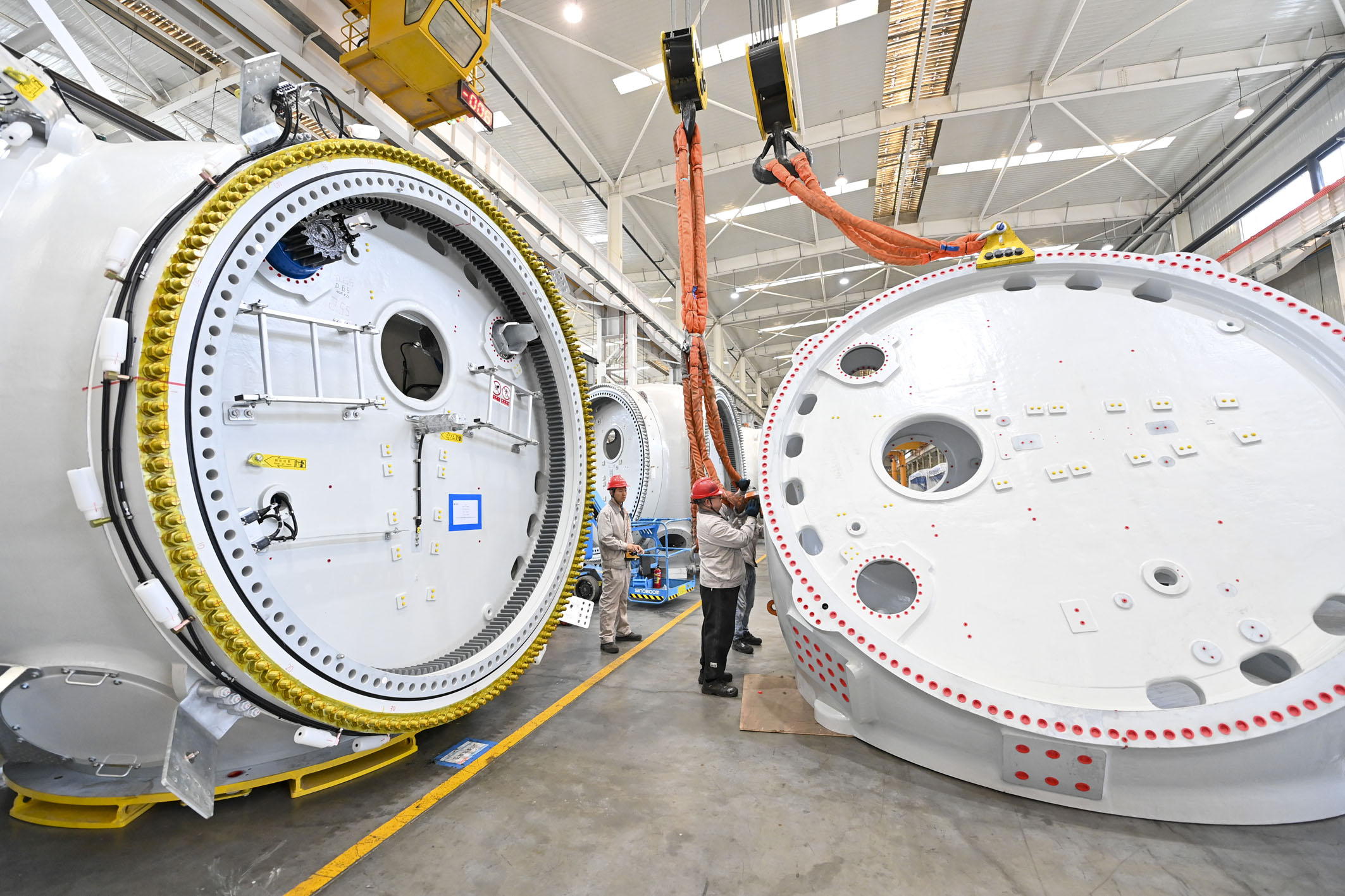 图为工人在位于山西转型综合改革示范区的太重集团新能源产业园区吊运风电装备。新华社记者杨晨光摄